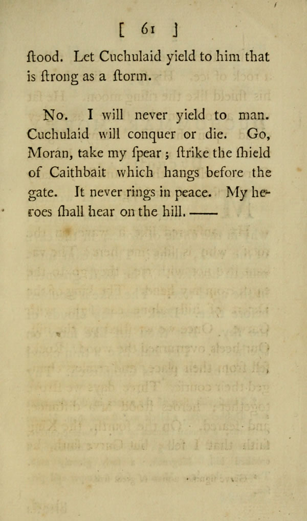 No. I will never yield to man. Cuchulaid will conquer or die. Go, Moran, take my spear; strike the shield of Caithbait which hangs before the gate. It never rings in peace. My heroes shall hear on the hill.——