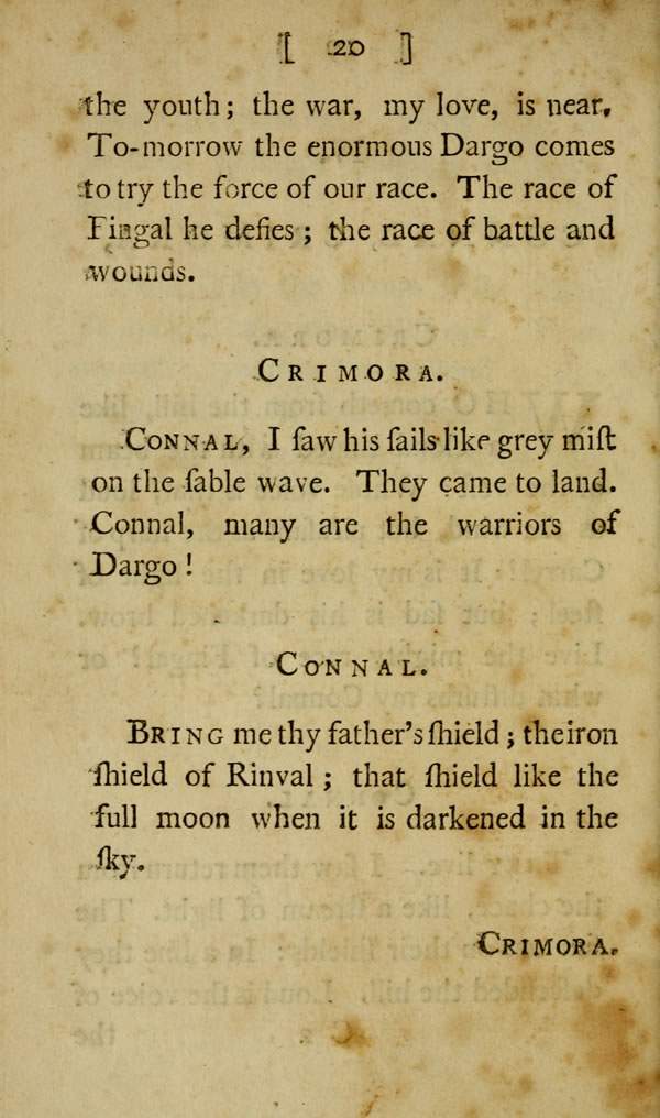 Crimora.Who cometh from the hill, like a cloud tinged with the beam of the west? Whose voice is that, loud as the wind, but pleasant as the harp of Carryl? It is my love in the light of steel; but sad is his darkened brow. Live the mighty race of Fingal? or what disturbs my Connal?