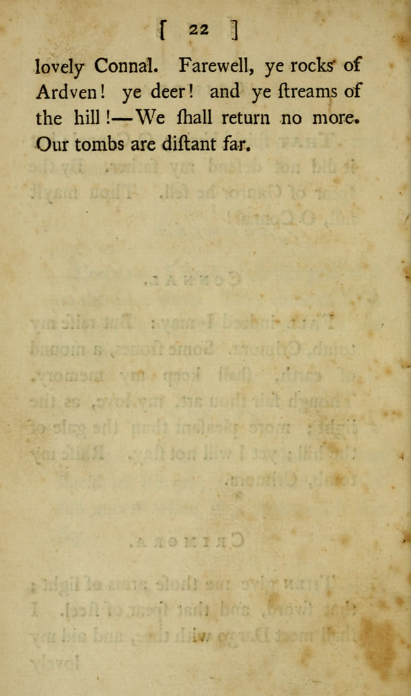 Fall indeed I may: But raise my tomb, Crimora. Some stones, a mound of earth, shall keep my memory. Though fair thou art, my love, as the light; more pleasant than the gale of the hill; yet I will not stay. Raise my tomb, Crimora.