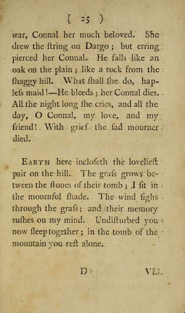 Earth here incloseth the loveliest pair on the hill. The grass grows between the stones of their tomb; I sit in the mournful shade. The wind sighs through the grass; and their memory rushes on my mind. Undisturbed you now sleep together; in the tomb of the mountain you rest alone.