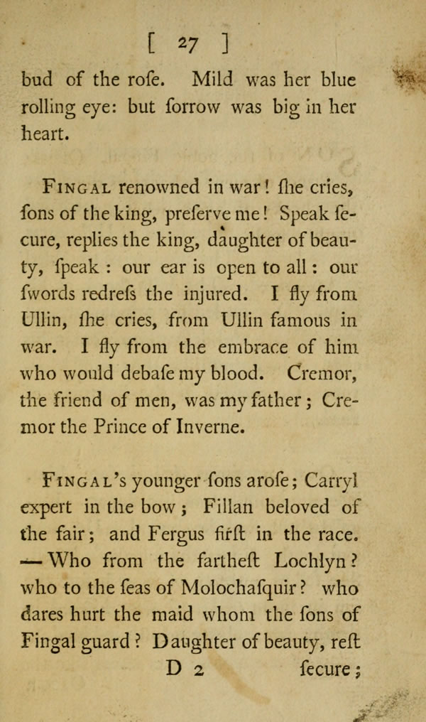 Fingal renowned in war! she cries, sons of the king, preserve me! Speak secure, replies the king, daughter of beauty, speak: our ear is open to all: our swords redress the injured. I fly from Ullin, she cries, from Ullin famous in war. I fly from the embrace of him who would debase my blood. Cremor, the friend of men, was my father; Cremor the Prince of Inverne.