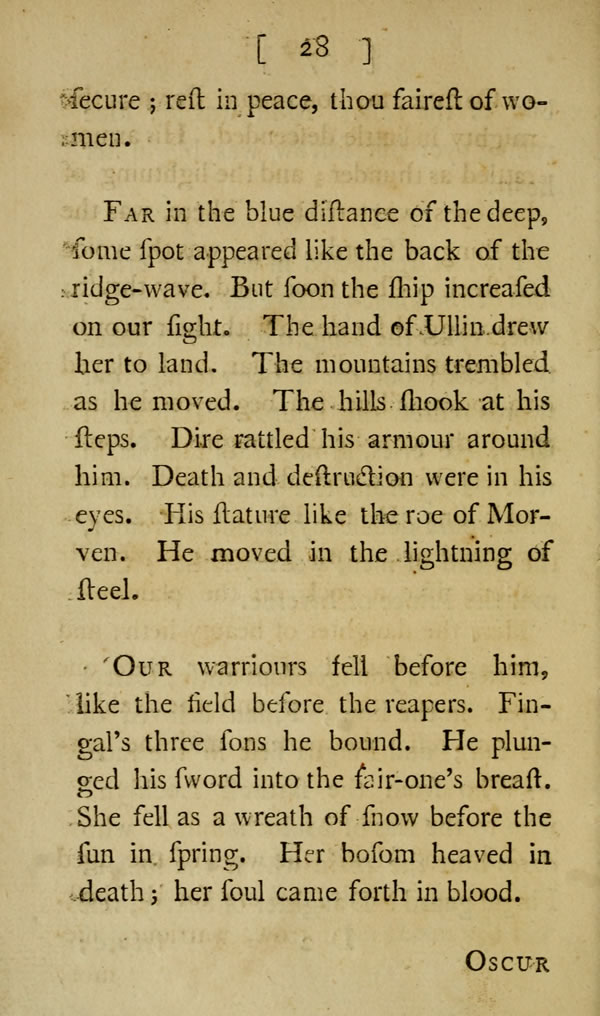 Oscur my son came down; the mighty in battle descended. His armour rattled as thunder; and the lightning of his eyes was terrible. There, was the clashing of swords; there, was the voice of steel. They struck and they thrust; they digged for death with their swords. But death was distant far, and delayed to come. The sun began to decline; and the cow-herd thought of home. Then Oscur's keen steel found the heart of Ullin. He fell like a mountain-oak covered over with glistering frost: He shone like a rock on the plain.——Here the daughter of beauty lieth; and here the bravest of men. Here one day ended the fair and the valiant. Here rest the pursuer and the pursued.