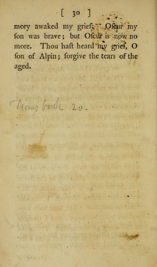 Oscur is now no more. Thou hast heard my grief, O son of Alpin; forgive the tears of the