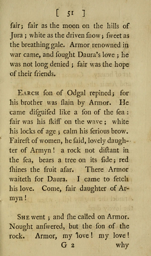 Earch son of Odgal repined; for his brother was slain by Armor. He came disguised like a son of the sea: fair was his skiff on the wave; white his locks of age; calm his serious brow. Fairest of women, he said, lovely daughter of Armyn! a rock not distant in the sea, bears a tree on its side; red shines the fruit afar. There Armor waiteth for Daura. I came to fetch his love. Come, fair daughter of Armyn!