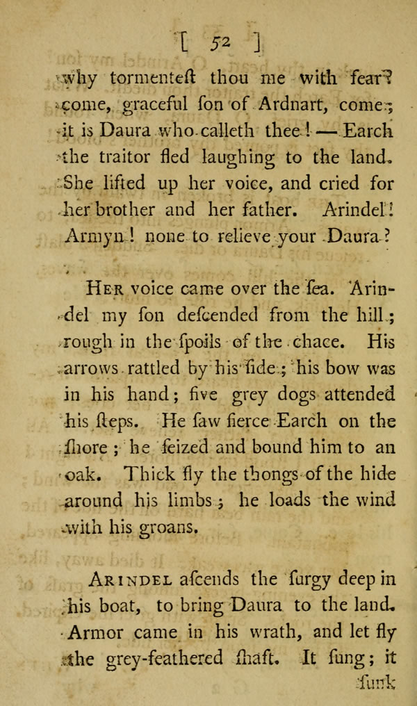 Her voice came over the sea. Arindel my son descended from the hill; rough in the spoils of the chace. His arrows rattled by his fide; his bow was in his hand; five grey dogs attended his steps. He saw fierce Earch on the shore; he seized and bound him to an oak. Thick fly the thongs of the hide around his limbs; he loads the wind with his groans.