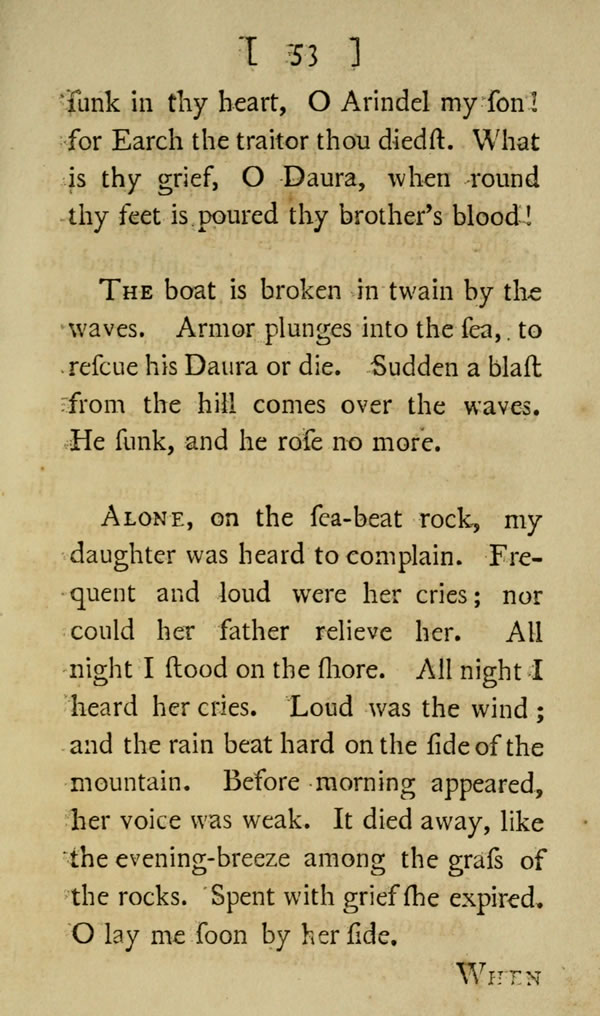 Alone, on the sea-beat rock, my daughter was heard to complain. Frequent and loud were her cries; nor could her father relieve her. All night I stood on the shore. All night I heard her cries. Loud was the wind; and the rain beat hard on the side of the mountain. Before morning appeared, her voice was weak. It died away, like the evening-breeze among the grass of the rocks. Spent with grief she expired. O lay me soon by her side.