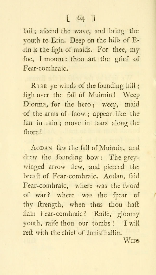Aodan saw the fall of Muirnin, and drew the sounding bow: The grey-winged arrow flew, and pierced the breast of Fear-comhraic. Aodan, said Fear-comhraic, where was the sword of war? where was the spear of thy strength, when thus thou hast slain Fear-comhraic? Raise, gloomy youth, raise thou our tombs! I will rest with the chief of Innisfhallin.