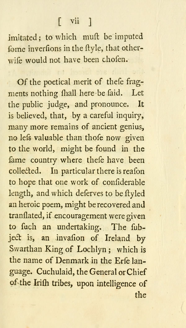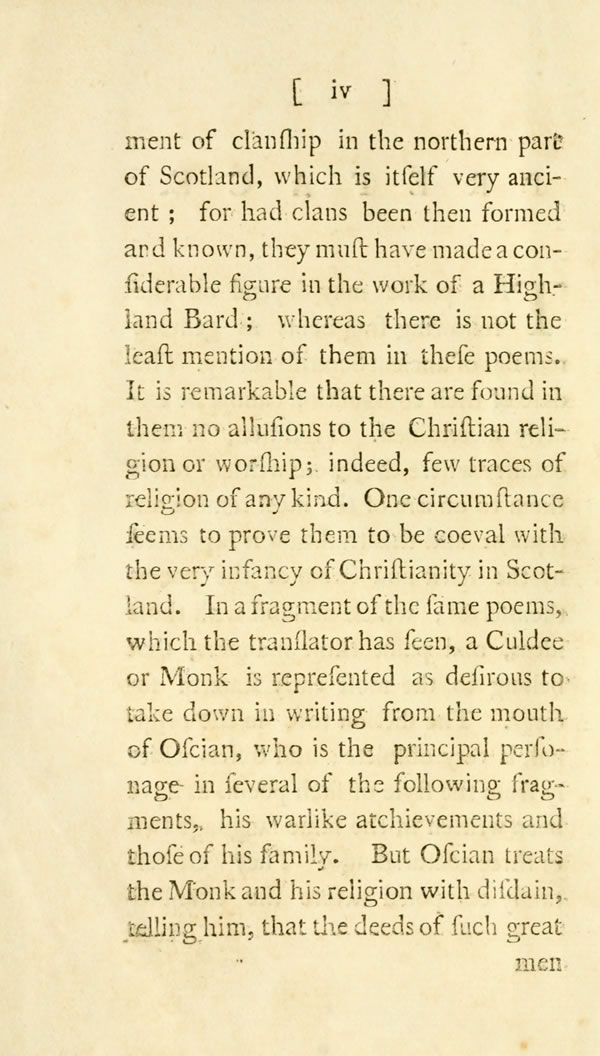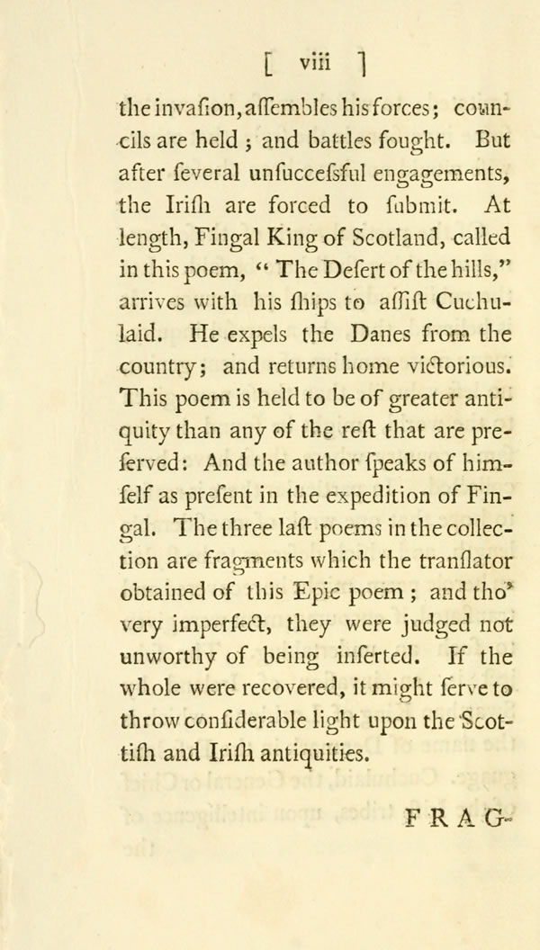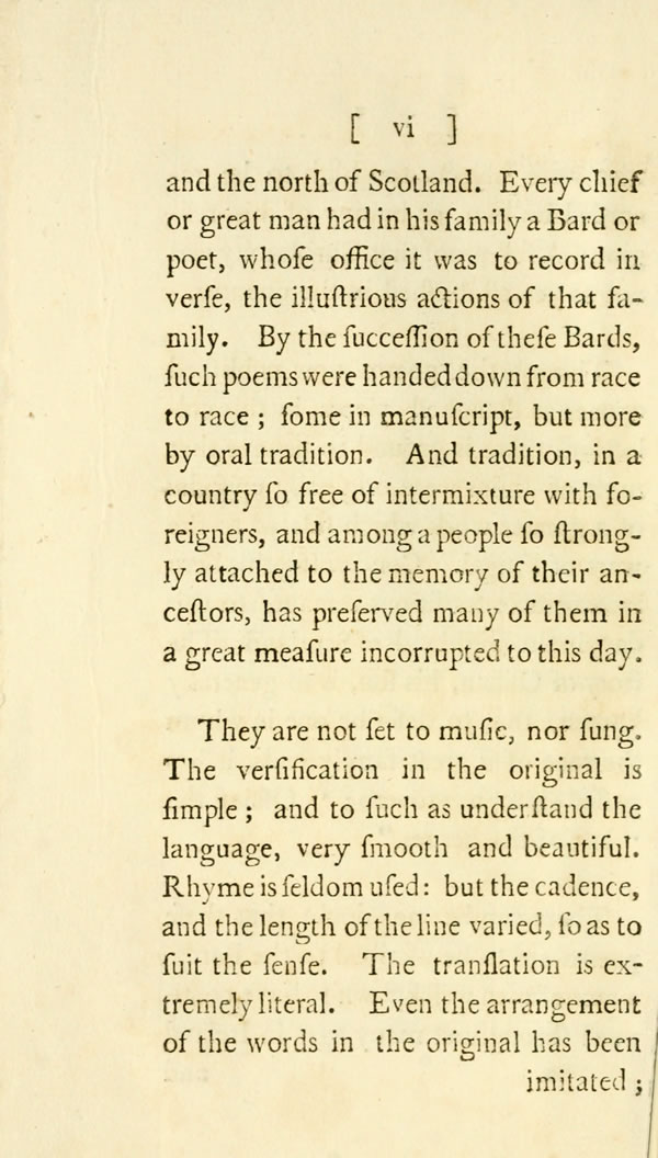 Though the poems now published appear as detached pieces in this collection, there is ground to believe that most of them were originally episodes of a greater work which related to the wars of Fingal. Concerning this hero innumerable traditions remain, to this day, in the Highlands of Scotland. The story of Oscian, his son, is so generally known, that to describe one in whom the race of a great family ends, it has passed into a proverb; "Oscian the last of the heroes."