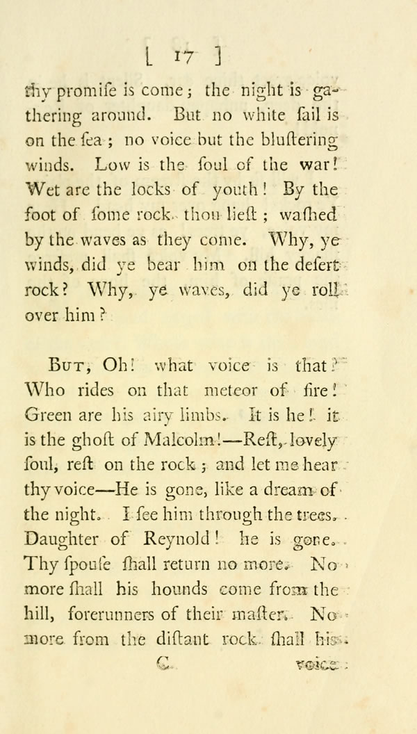 Tossed on the wavy ocean is He, the hope of the isles; Malcolm, the support of the poor; foe to the proud in arms! Why hast thou left us behind? why live we to mourn thy fate? We might have heard, with thee, the voice of the deep; have seen the oozy rock.