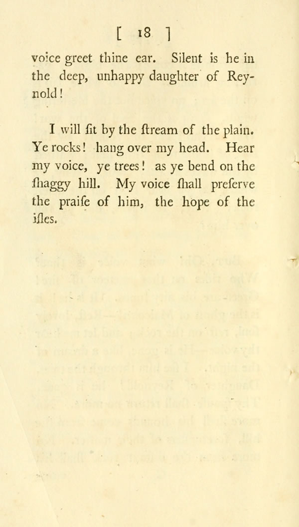 I will sit by the stream of the plain. Ye rocks! hang over my head. Hear my voice, ye trees! as ye bend on the shaggy hill. My voice shall preserve the praise of him, the hope of the isles.