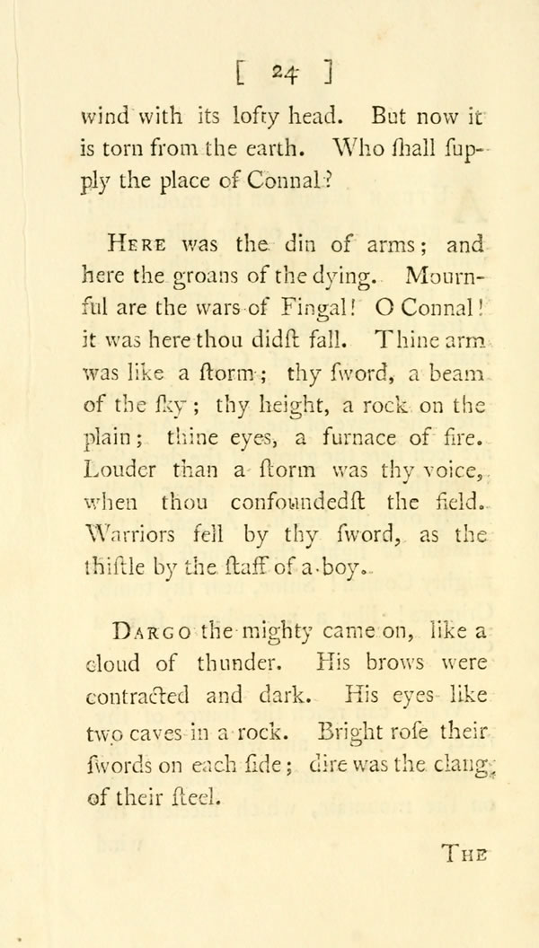 Here was the din of arms; and here the groans of the dying. Mournful are the wars of Fingal! O Connal! it was here thou didst fall. Thine arm was like a storm; thy sword, a beam of the sky; thy height, a rock on the plain; thine eyes, a furnace of fire. Louder than a storm was thy voice, when thou confoundedst the field. Warriors fell by thy sword, as the thistle by the staff of a boy.