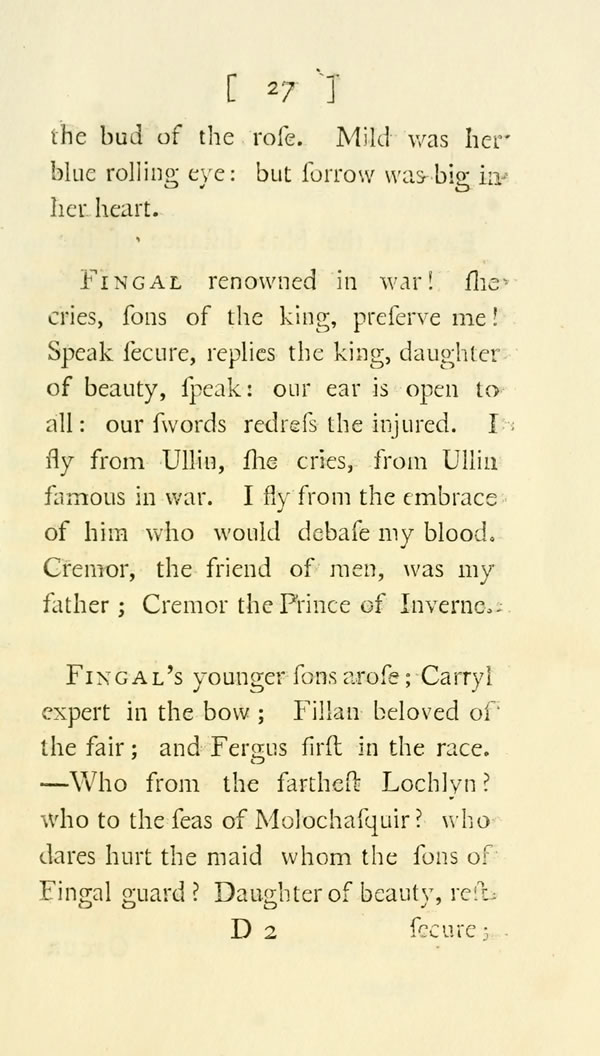 Fingal renowned in war! she cries, sons of the king, preserve me! Speak secure, replies the king, daughter of beauty, speak: our ear is open to all: our swords redress the injured. I fly from Ullin, she cries, from Ullin famous in war. I fly from the embrace of him who would debase my blood. Cremor, the friend of men, was my father; Cremor the Prince of Inverne.
