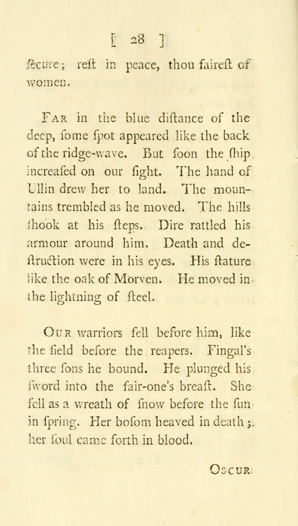Oscur my son came down; the mighty in battle descended. His armour rattled as thunder; and the lightning of his eyes was terrible. There, was the clashing of swords; there, was the voice of steel. They struck and they thrust; they digged for death with their swords. But death was distant far, and delayed to come. The sun began to decline; and the cow-herd thought of home. Then Oscur's keen steel found the heart of Ullin. He fell like a mountain-oak covered over with glistering frost: He shone like a rock on the plain.——Here the daughter of beauty lieth; and here the bravest of men. Here one day ended the fair and the valiant. Here rest the pursuer and the pursued.