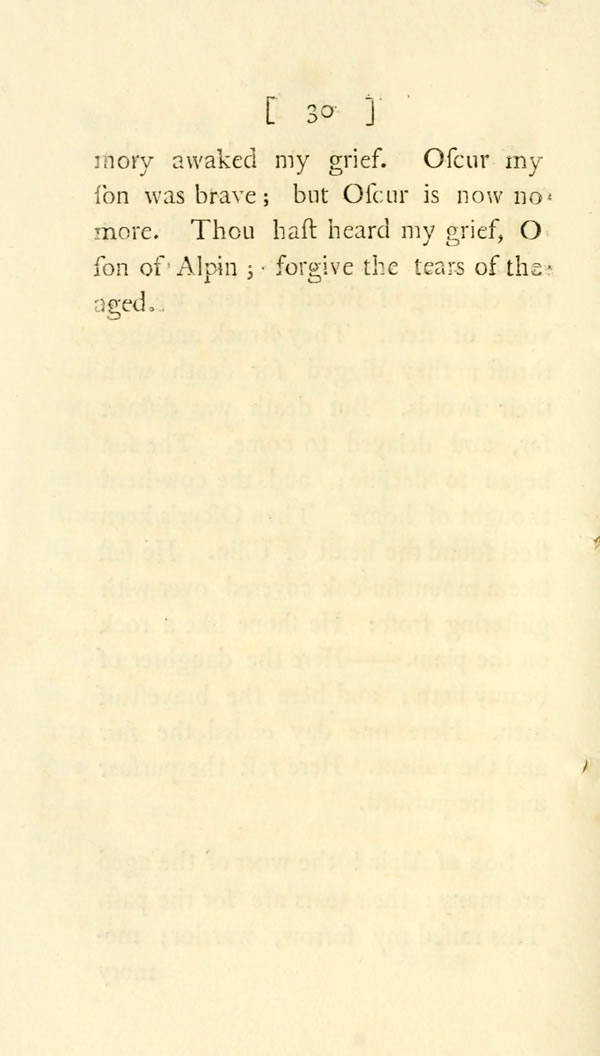 Oscur is now no more. Thou hast heard my grief, O son of Alpin; forgive the tears of the