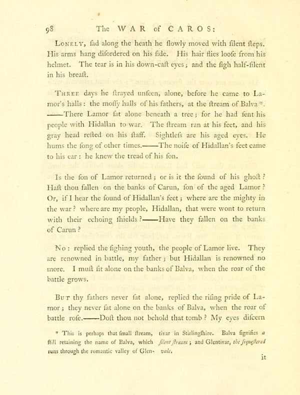 Three days he strayed unseen, alone, before he came to Lamor's halls: the mossy halls of his fathers, at the stream of BalvaDisplay note.——There Lamor sat alone beneath a tree; for he had sent his people with Hidallan to war. The stream ran at his feet, and his gray head rested on his staff. Sightless are his aged eyes. He hums the song of other times.——The noise of Hidallan's feet came to his ear: he knew the tread of his son.