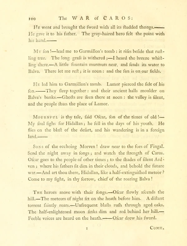 But lead me, O Malvina, to the sound of my woods, and the roar of my mountain streams. Let the chace be heard on Cona; that I may think on the days of other years.—And bring me the harp, O maid, that I may touch it when the light of my soul shall arise.——Be thou near, to learn the song; and future times shall hear of Ossian.