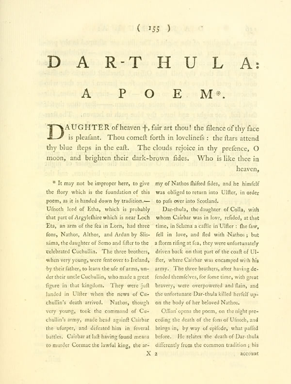 Why art thou sad, O Nathos, said the lovely daughter of Colla? Thou art a pillar of light to Dar-thula: the joy of her eyes is in Etha's chief. Where is my friendDisplay note, but Nathos? My father rests in the tomb. Silence dwells on Seláma: sadness spreads on the blue streams of my land. My friends have fallen, with Cormac. The mighty were slain in the battle of Ullin.