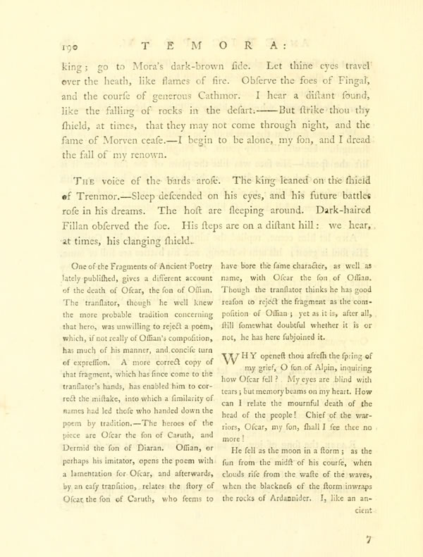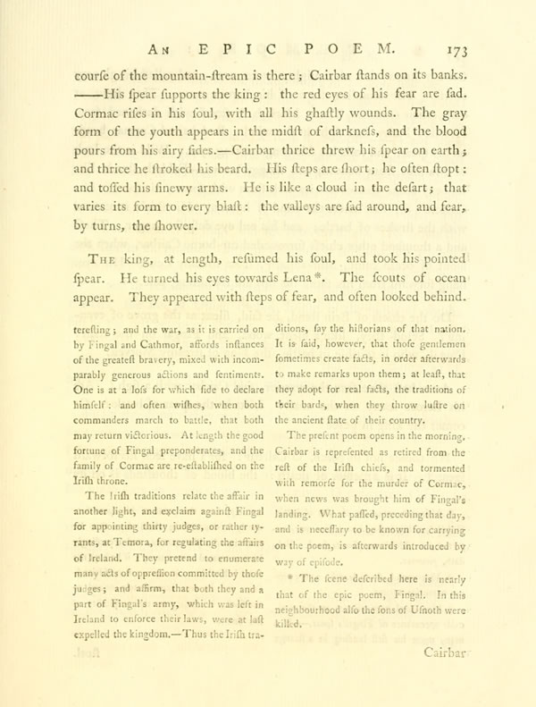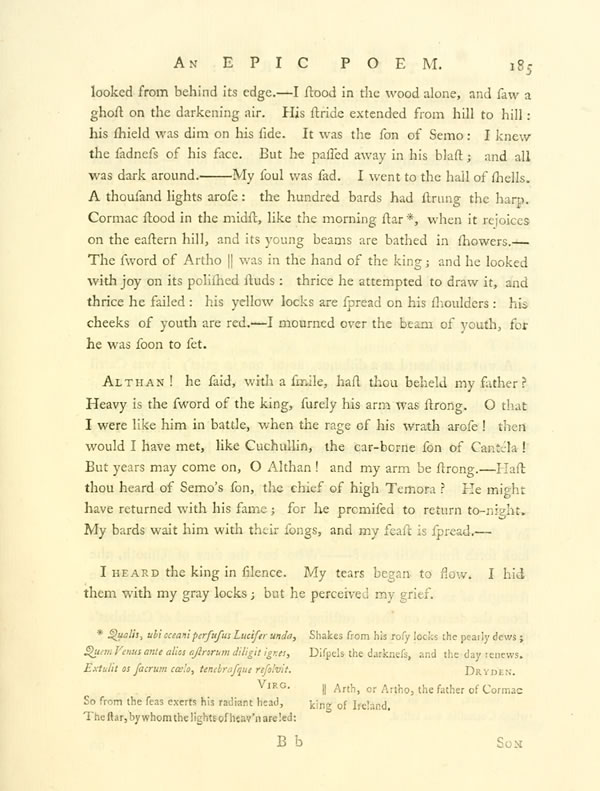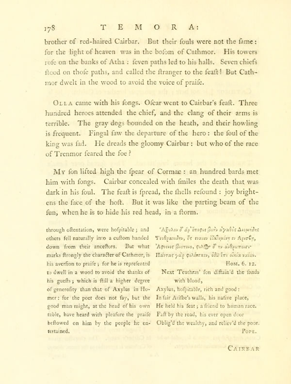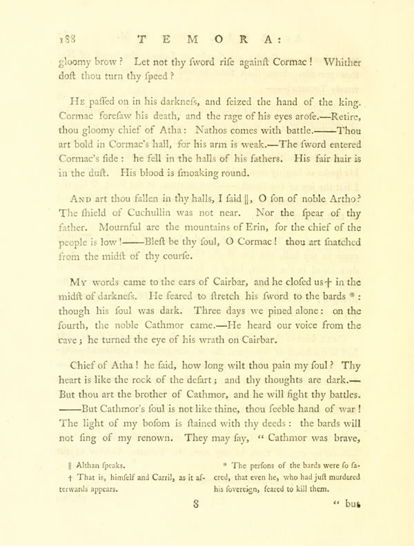 My words came to the ears of Cairbar, and he closed usDisplay note in the midst of darkness. He feared to stretch his sword to the bardsDisplay note: though his soul was dark. Three days we pined alone: on the fourth, the noble Cathmor came.—He heard our voice from the cave; he turned the eye of his wrath on Cairbar.