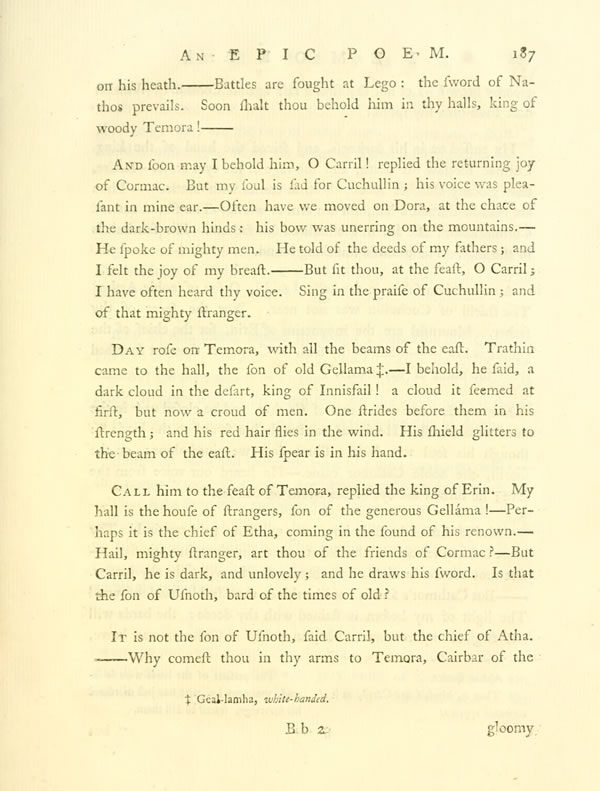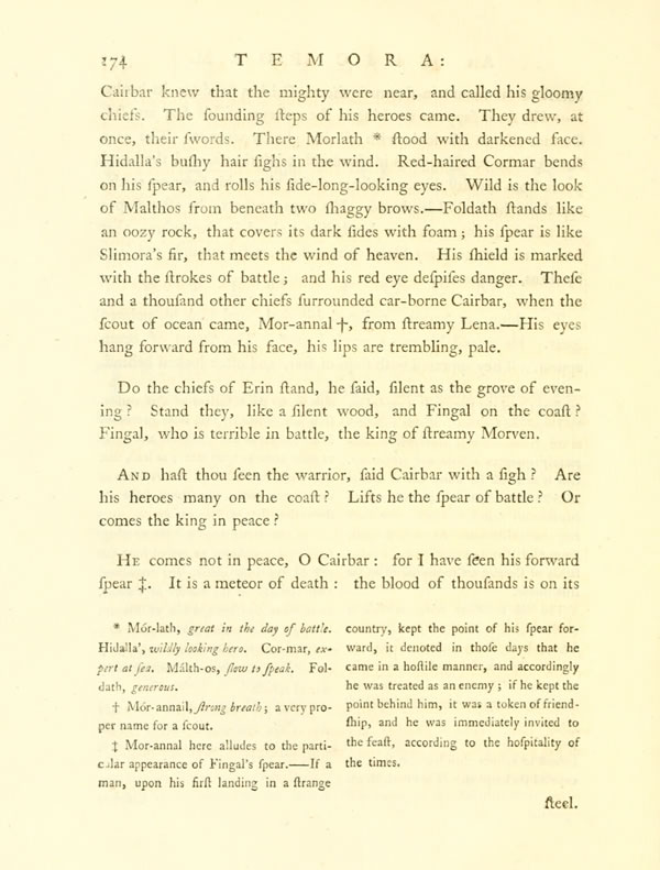 Day rose on Temora, with all the beams of the east. Trathin came to the hall, the son of old GellamaDisplay note.—I behold, he said, a dark cloud in the desart, king of Innisfail! a cloud it seemed at first, but now a croud of men. One strides before them in his strength; and his red hair flies in the wind. His shield glitters to the beam of the east. His spear is in his hand.