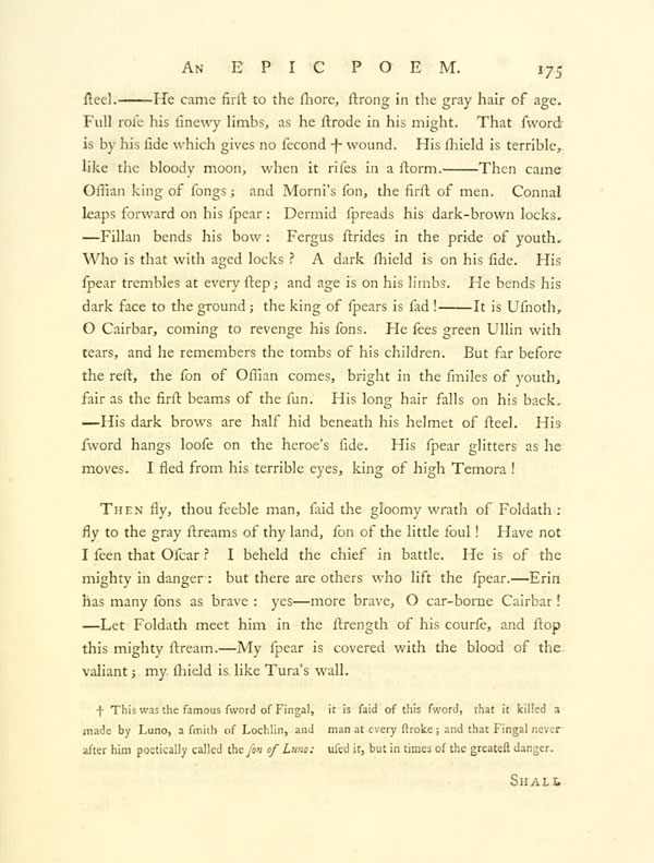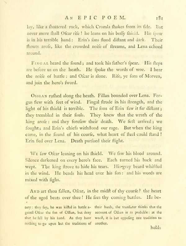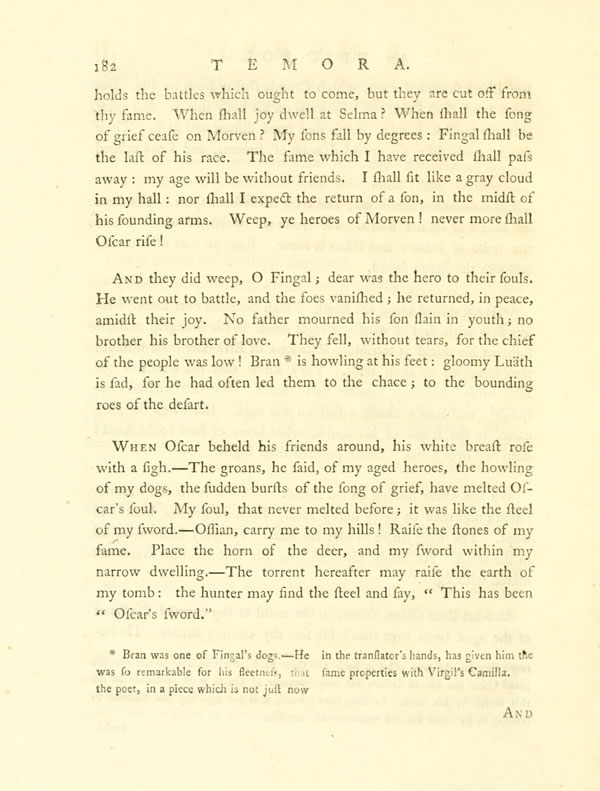 When Oscar beheld his friends around, his white breast rose with a sigh.—The groans, he said, of my aged heroes, the howling of my dogs, the sudden bursts of the song of grief, have melted Oscar's soul. My soul, that never melted before; it was like the steel of my sword.—Ossian, carry me to my hills! Raise the stones of my fame. Place the horn of the deer, and my sword within my narrow dwelling.—The torrent hereafter may raise the earth of my tomb: the hunter may find the steel and say, "This has been "Oscar's sword."