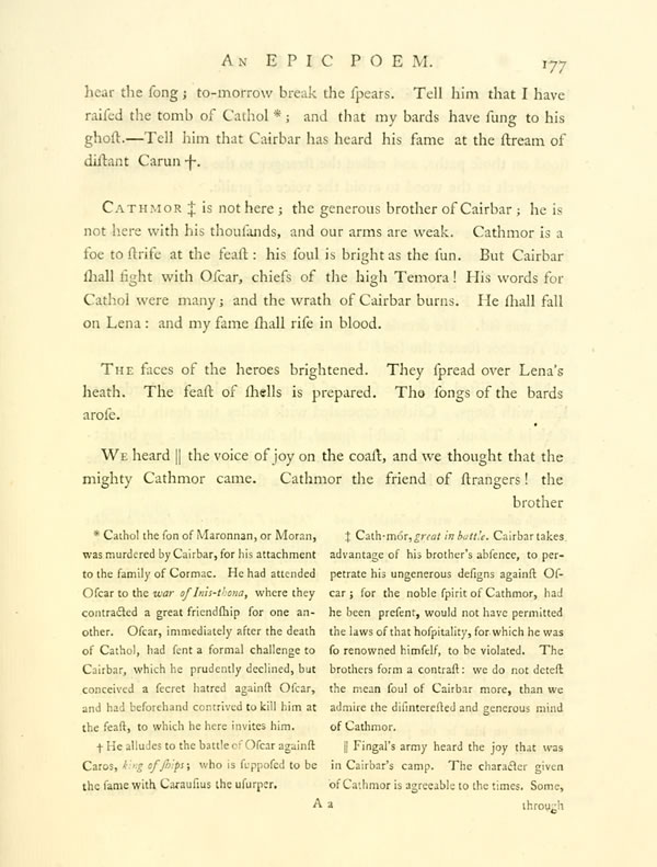 CathmorDisplay note is not here; the generous brother of Cairbar; he is not here with his thousands, and our arms are weak. Cathmor is a foe to strife at the feast: his soul is bright as the sun. But Cairbar shall light with Oscar, chiefs of the high Temora! His words for Cathol were many; and the wrath of Cairbar burns. He shall fall on Lena: and my fame shall rise in blood.