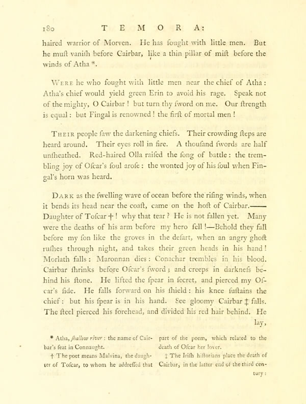 Oscar! said the dark-red Cairbar, I behold the spearDisplay note of Erin's kings. The spear of TemoraDisplay note glitters in thy hand, son of the woody Morven! It was the pride of an hundred kings, the death of heroes of old. Yield it, son of Ossian, yield it to car-borne Cairbar.