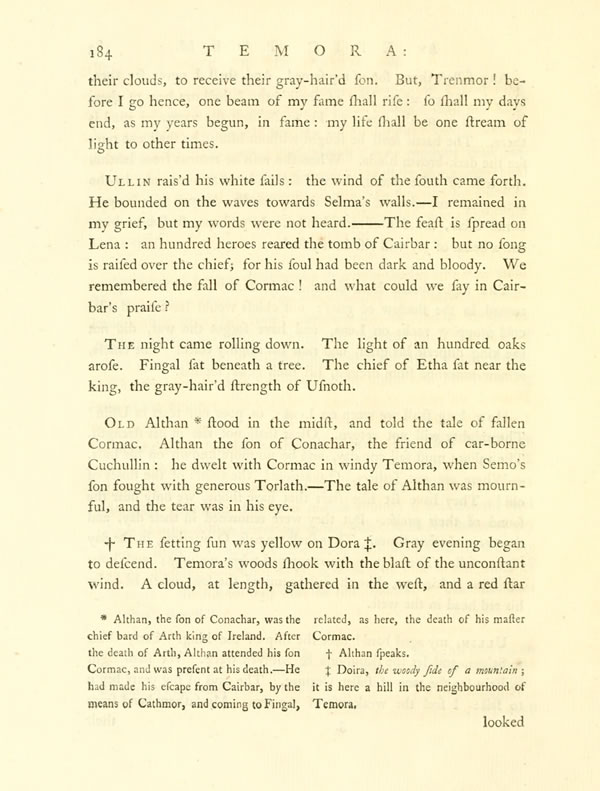 Old AlthanDisplay note stood in the midst, and told the tale of fallen Cormac. Althan the son of Conachar, the friend of car-borne Cuchullin: he dwelt with Cormac in windy Temora, when Semo's son fought with generous Torlath.—The tale of Althan was mournful, and the tear was in his eye.