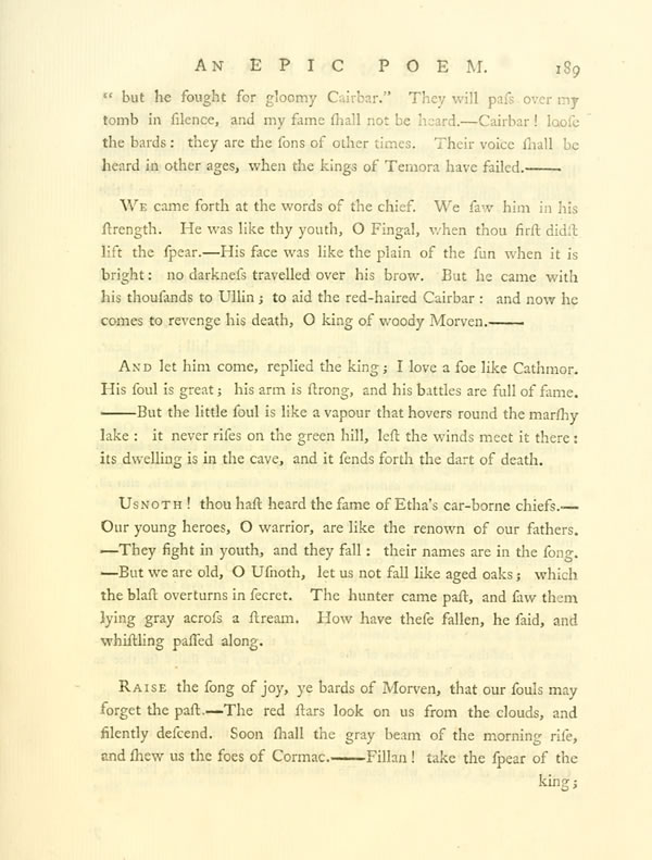 Sons of green Erin, begun the mild Hidalla, let not Fingal hear your words: lest the foe rejoice, and his arm be strong in the land.—Ye are brave, O warriors, and like the tempests of the desart; they meet the rocks without fear, and overturn the woods in their course.—But let us move in our strength, and flow as a gathered cloud, when the winds drive it from behind.——Then shall the mighty tremble, and the spear drop from the hand of the valiant.—We see the cloud of death, they will say; and their faces will turn pale. Fingal will mourn in his age; and say that his fame is ceased.—Morven will behold his chiefs no more: the moss of years shall grow in Selma.