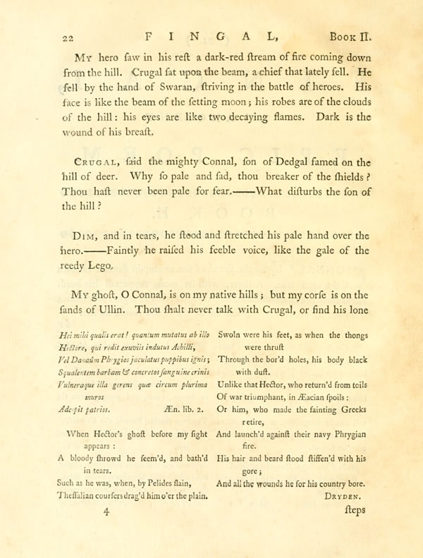 But where are my friends in battle? The companions of my arm in danger? Where art thou, white-bosom'd Cathbat? Where is that cloud in war, DuchomarDisplay note: and hast thou left me, O FergusDisplay note! in the day of the storm? Fergus, first in our joy at the feast; son of Rossa! arm of death! comest thou like a roeDisplay note from Malmor. Like a hart from the ecchoing hills? ——Hail thou son of Rossa! what shades the soul of war?