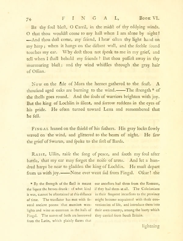 Peace, said Cuchullin, to the souls of the heroes; their deeds were great in danger. Let them ride aroundDisplay note me on clouds and shew their features of war: that my soul may be strong in danger; my arm like the thunder of heaven.——But be thou on a moon-beam, O Morna, near the window of my rest; when my thoughts are of peace; and the din of arms is over.——Gather the strength of the tribes, and move to the Wars of Erin.——Attend the car of my battles; and rejoice in the noise of my course.——Place three spears by my side; and follow the bounding of my steeds. That my soul may be strong in my friends, when the battle darkens round the beams of my steel.