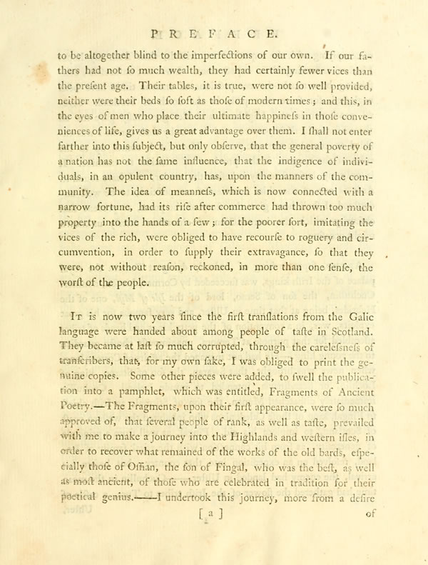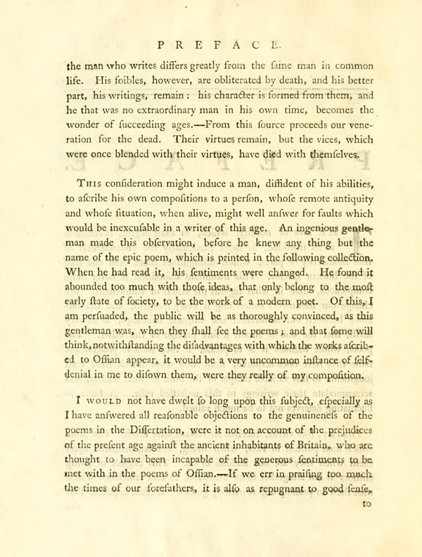 This consideration might induce a man, diffident of his abilities, to ascribe his own compositions to a person, whose remote antiquity and whose situation, when alive, might well answer for faults which would be inexcusable in a writer of this age. An ingenious gentleman made this observation, before he knew any thing but the name of the epic poem, which is printed in the following collection. When he had read it, his sentiments were changed. He found it abounded too much with those ideas, that only belong to the most early state of society, to be the work of a modern poet. Of this, I am persuaded, the public will be as thoroughly convinced, as this gentleman was, when they shall see the poems; and that some will think, notwithstanding the disadvantages with which the works ascribed to Ossian appear, it would be a very uncommon instance of self-denial in me to disown them, were they really of my composition.