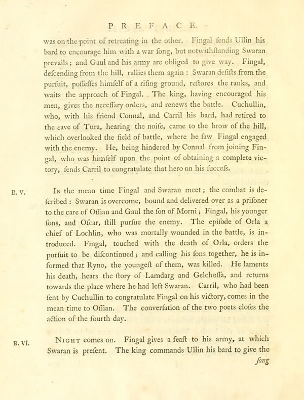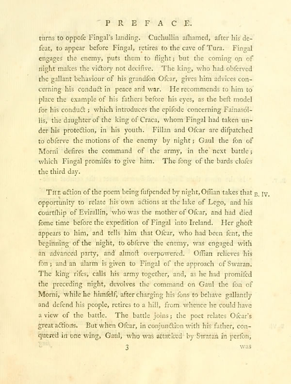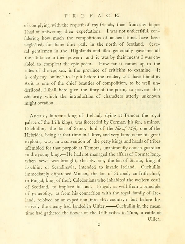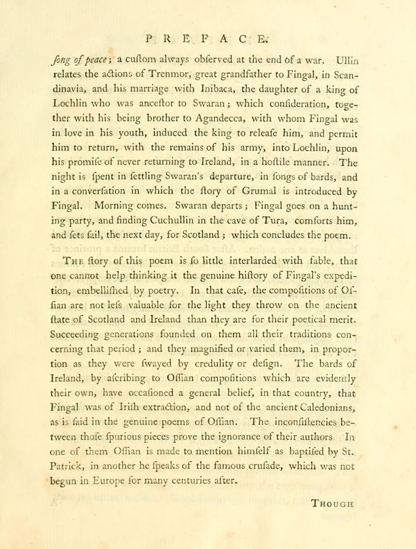 Had the Senachies of Ireland been as well acquainted with the antiquities of their nation as they pretended, they might derive as much honour from Fingal's being a Caledonian, as if he had been an Irishman; for both nations were almost the same people in the days of that hero. The Celtæ, who inhabited Britain and Ireland before the invasion of the Romans, though they were divided into numerous tribes, yet, as the same language and customs, and the memory of their common origin remained among them, they considered themselves as one nation. After South Britain became a province of Rome, and its inhabitants begun to adopt the language and customs of their conquerors, the Celtæ beyond the pale of the empire, considered them as a distinct people, and consequently treated them as enemies. On the other hand, the strictest amity subsisted between the Irish and Scots Celtæ for many ages, and the customs and ancient language of both still remaining, leave no room to doubt that they were of old one and the same nation.