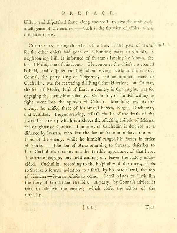 Display noteCuchullin, sitting alone beneath a tree, at the gate of Tura, for the other chiefs had gone on a hunting party to Cromla, a neighbouring hill, is informed of Swaran's landing by Moran, the son of Fithil, one of his scouts. He convenes the chiefs; a council is held, and disputes run high about giving battle to the enemy. Connal, the petty king of Togorma, and an intimate friend of Cuchullin, was for retreating till Fingal shiould arrive; but Calmar, the son of Matha, lord of Lara, a country in Connaught, was for engaging the enemy immediately.—Cuchullin, of himself willing to fight, went into the opinion of Calmar. Marching towards the enemy, he missed three of his bravest heroes, Fergus, Duchomar, and Caithbat. Fergus arriving, tells Cuchullin of the death of the two other chiefs; which introduces the affecting episode of Morna, the daughter of Cormac—The army of Cuchullin is deferred at a distance by Swaran, who sent the son of Arno to observe the motions of the enemy, while he himself ranged his forces in order of battle.——The son of Arno returning to Swaran, describes to him Cuchullin's chariot, and the terrible appearance of that hero. The armies engage, but night coming on, leaves the victory undecided. Cuchullin, according to the hospitality of the times, sends to Swaran a formal invitation to a feast, by his bard Carril, the son of Kinfena.—Swaran refuses to come. Carril relates to Cuchullin the story of Grudar and Brassolis. A party, by Connal's advice, is sent to observe the enemy; which closes the action of the first day.