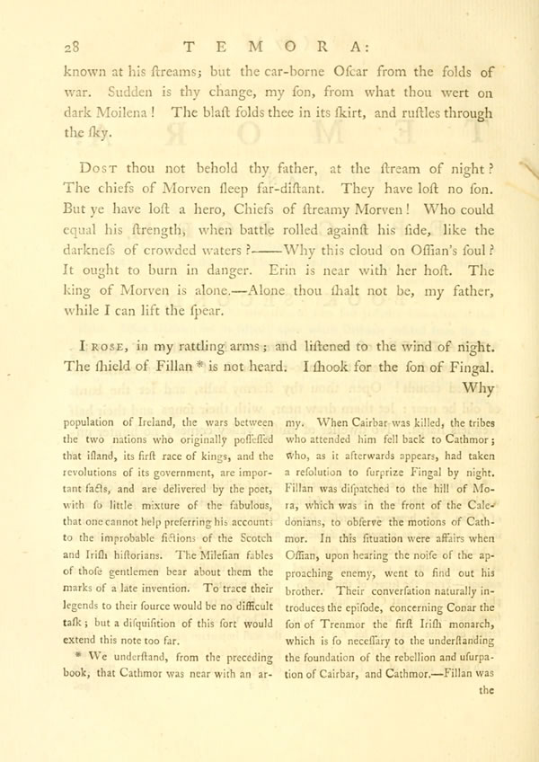 Display noteFather of heroes, Trenmor! dweller of eddying winds! where the dark-red course of thunder marks the troubled clouds! Open thou thy stormy halls, and let the bards of old be near: let them draw near, with their songs and their half viewless harps. No dweller of misty valley comes; no hunter unknown [ 28 ] View Page Image known at his streams; but the car-borne Oscar from the folds of war. Sudden is thy change, my son, from what thou wert on dark Moilena! The blast folds thee in its skirt, and rustles through the sky.