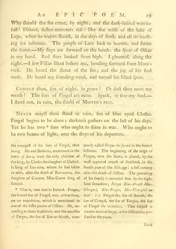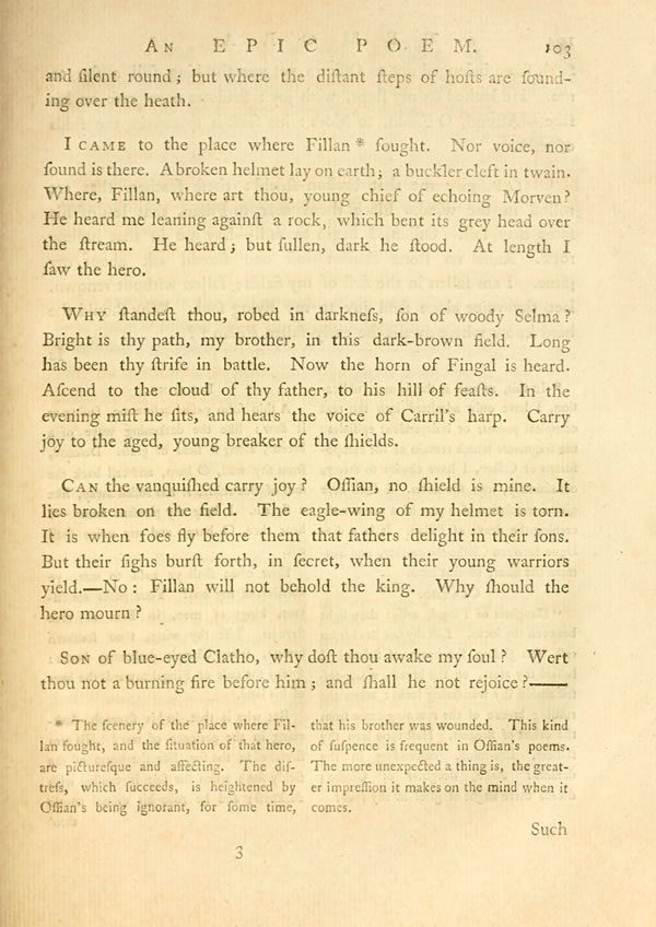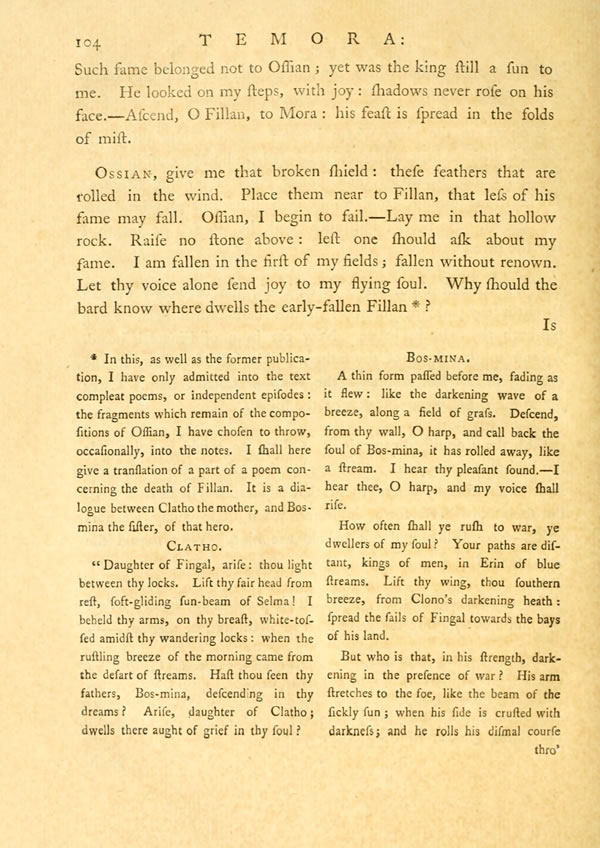 Never mayst thou stand in vain, son of blue eyed Clatho. Fingal begins to be alone; darkness gathers on the last of his days. Yet he has twoDisplay note sons who ought to shine in war. Who ought to be two beams of light, near the steps of his departure.