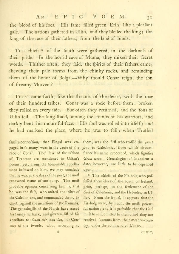 ConarDisplay notewas the brother of Trathal, first of mortal men. His battles were on every coast. A thousand streams rolled down [ 31 ] View Page Imagethe blood of his foes. His fame filled green Erin, like a pleasant gale. The nations gathered in Ullin, and they blessed the king; the king of the race of their fathers, from the land of hinds.