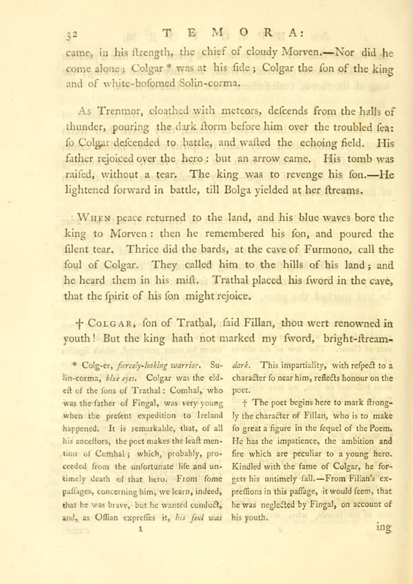 They came forth, like the streams of the desart, with the roar of their hundred tribes. Conar was a rock before them: broken they rolled on every side. But often they returned, and the sons of Ullin fell. The king stood, among the tombs of his warriors, and darkly bent his mournful face. His soul was rolled into itself; and he had marked the place, where he was to fall; when Trathal [ 32 ] View Page Imagecame, in his strength, the chief of cloudy Morven.—Nor did he come alone; ColgarDisplay note was at his side; Colgar the son of the king and of white-bosomed Solin-corma.