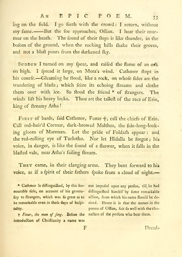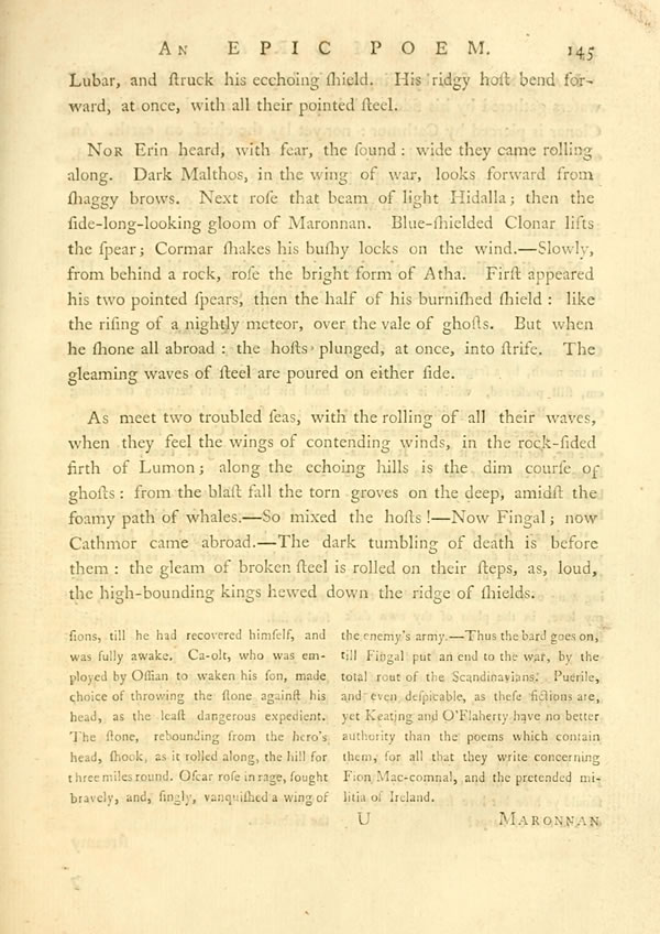 Nor Erin heard, with fear, the sound: wide they came rolling along. Dark Malthos, in the wing of war, looks forward from shaggy brows. Next rose that beam of light Hidalla; then the side-long-looking gloom of Maronnan. Blue-shielded Clonar lifts the spear; Cormar shakes his bushy locks on the wind.—Slowly, from behind a rock, rose the bright form of Atha. First appeared his two pointed spears, then the half of his burnished shield: like the rising of a nightly meteor, over the vale of ghosts. But when he shone all abroad: the hosts· plunged, at once, into strife. The gleaming waves of steel are poured on either side.