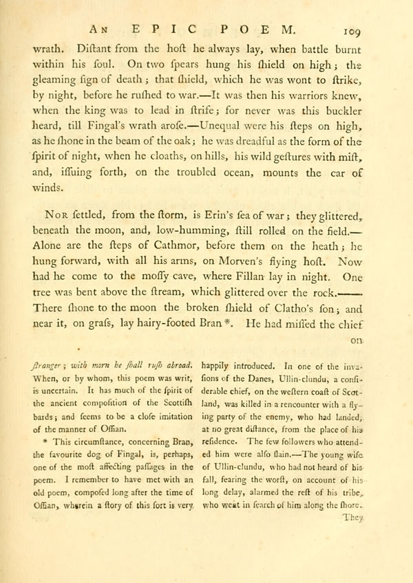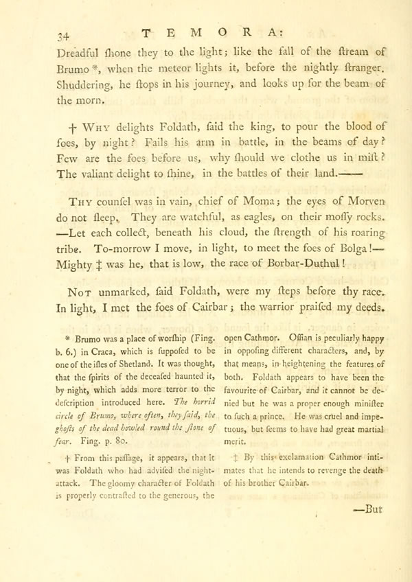 They came, in their clanging arms. They bent forward to his voice, as if a spirit of their fathers spoke from a cloud of night.— [ 34 ] View Page ImageDreadful shone they to the light; like the fall of the stream of Brumo,Display notewhen the meteor lights it, before the nightly stranger. Shuddering, he stops in his journey, and looks up for the beam of the morn.
