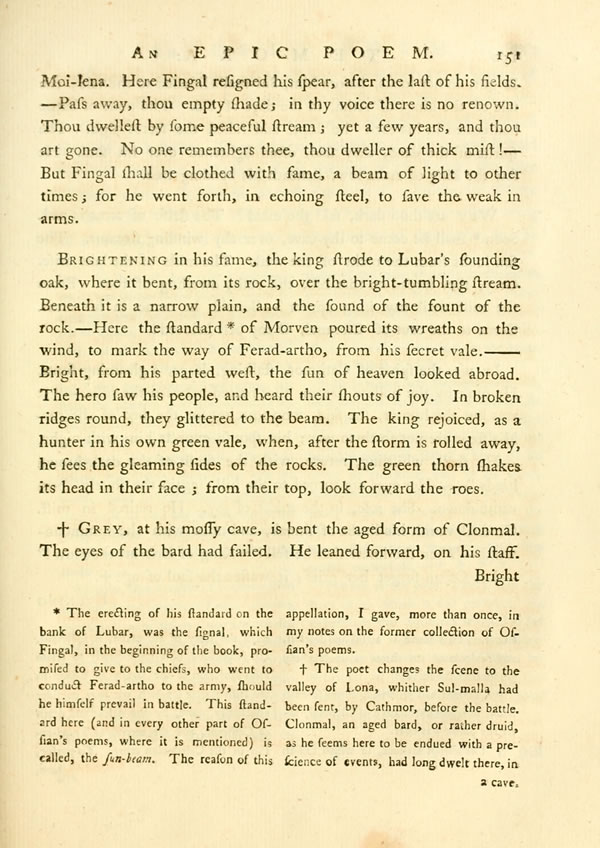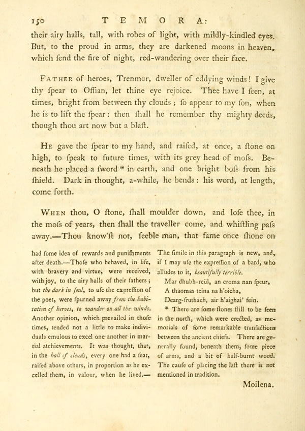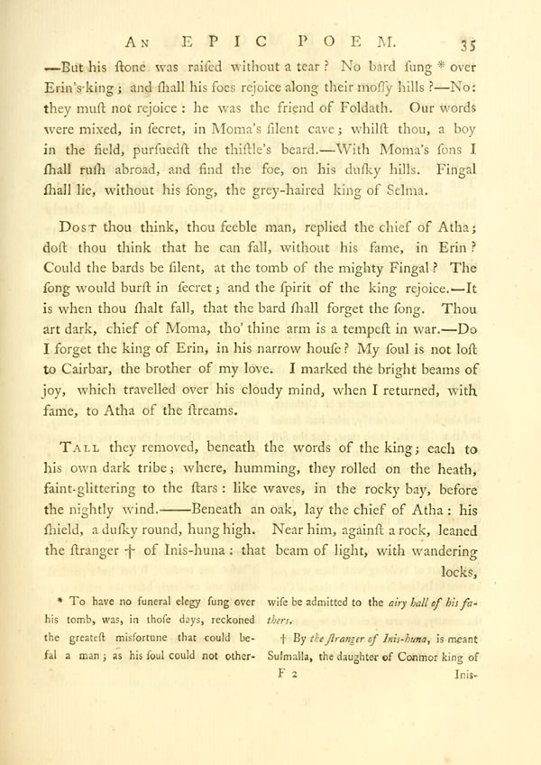 When thou, O stone, shall moulder down, and lose thee, in the moss of years, then shall the traveller come, and whistling pass away.—Thou know'st not, feeble man, that fame once shone on [ 151 ] View Page Image Μoi-lena. Here Fingal resigned his spear, after the last of his fields.—Pass away, thou empty shade; in thy voice there is no renown. Thou dwellest by some peaceful stream; yet a few years, and thou art gone. No one remembers thee, thou dweller of thick mist!—But Fingal shall be clothed with fame, a beam of light to other times; for he went forth, in echoing steel, to save the weak in arms.