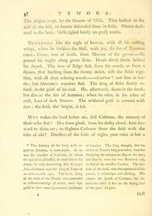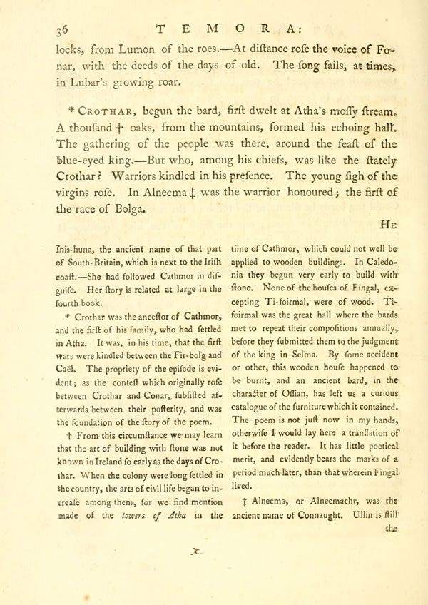 Display noteCrothar, begun the bard, first dwelt at Atha's mossy stream. A thousandDisplay note oaks, from the mountains, formed his echoing halt. The gathering of the people was there, around the feast of the blue-eyed king.—But who, among his chiefs, was like the stately Crothar? Warriors kindled in his presence. The young sigh of the virgins rose. In AlnecmaDisplay note was the warrior honoured; the first of the race of Bolga.