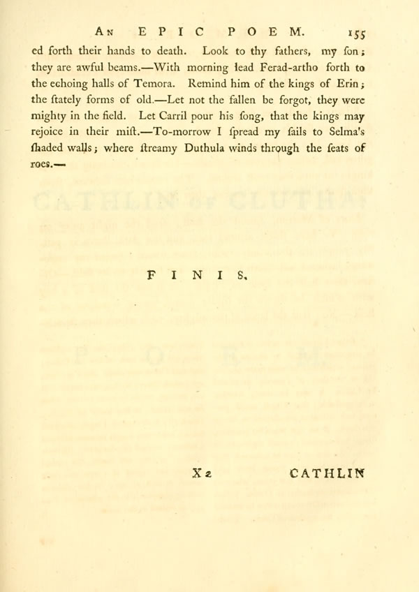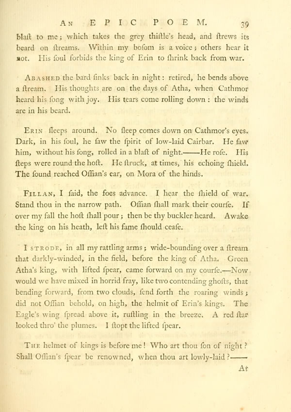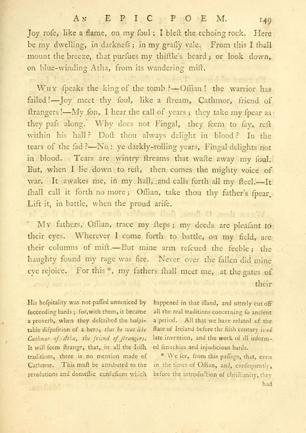 Why speaks the king of the tomb?—Ossian! the warrior has failed!—Joy meet thy soul, like a stream, Cathmor, friend of strangers!—My son, I hear the call of years; they take my spear as they pass along. Why does not Fingal, they seem to say, rest within his hall? Dost thou always delight in blood? In the tears of the sad?—No: ye darkly-rolling years, Fingal delights not in blood. Tears are wintry streams that waste away my soul. But, when I lie down to rest, then comes the mighty voice of war. It awakes me, in my hall, and calls forth all my steel.—It shall call it forth no more; Ossian, take thou thy father’s spear. Lift it, in battle, when the proud arise.