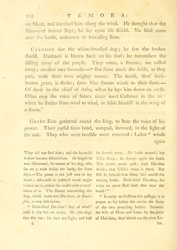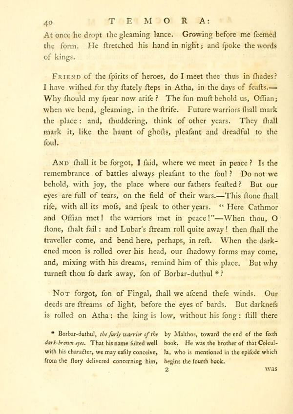But who, said the soft-voiced Carril, come like the bounding roes? their stature is like the young trees of the plain, growing in a shower:—Soft and ruddy are their cheeks; but fearless souls look forth from their eyes?——Who but the sons of UsnothDisplay note, the car-borne chiefs of Etha? The people rise on every side, like the strength of an half-extinguished fire, when the winds come, sudden, from the desart, on their rustling wings.—The sound of Caithbat'sDisplay note shield was heard. The heroes saw Cuchullin in Nathos.Display note So rolled his sparkling eyes: his steps were such on heath.——Battles are fought at Lego: the sword of Nathos prevails. Soon shalt thou behold him in thy halls, king of Temora of Groves!