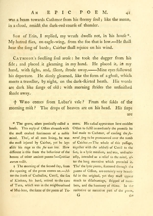 Not unmarked, said Foldath, were my steps before thy race. In light, I meet the foes of Cairbar; the warrior praised my deeds. [ 35 ] View Page Image—But his stone was raised without a tear? No bard sungDisplay note over Erin's king; and shall his foes rejoice along their mossy hills?—No: they must not rejoice: he was the friend of Foldath. Our words were mixed, in secret, in Moma's silent cave; whilst thou, a boy in the field, pursuedst the thistle's beard.—With Moma's sons I shall rush abroad, and find the foe, on his dusky hills. Fingal shall lie, without his song, the grey-haired king of Selma.