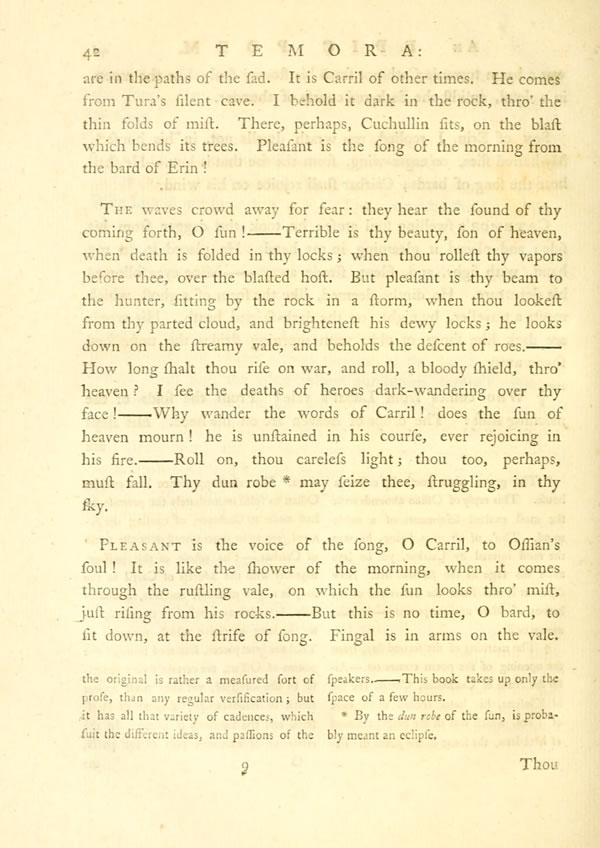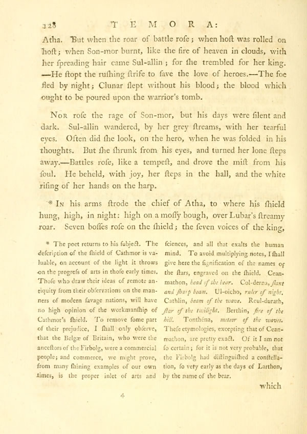 Display noteThe setting sun was yellow on Dora.Display note Grey evening began to descend. Temora's woods shook with the blast of the unconstant wind. A cloud, at length, gathered in the west, and a red star looked from behind its edge.—I stood in the wood alone, and saw a ghost on the darkening air. His stride extended from hill to hill: his shield was dim on his side. It was the son of Semo: I knew the warrior's face. But he passed away in his blast; and all was dark around.—My soul was sad. I went to the hall of shells. A thousand lights arose: the hundred bards had strung the harp. Cormac stood in the midst, like the morning star, when it rejoices on the eastern hill, and its young beams are bathed in showers.— The sword of ArthoDisplay note was in the hand of the king; and he looked with joy on its polished studs: thrice he attempted to draw it, and thrice he failed; his yellow locks are spread on his shoulders: his cheeks of youth are red.—I mourned over the beam of youth, for he was soon to set.