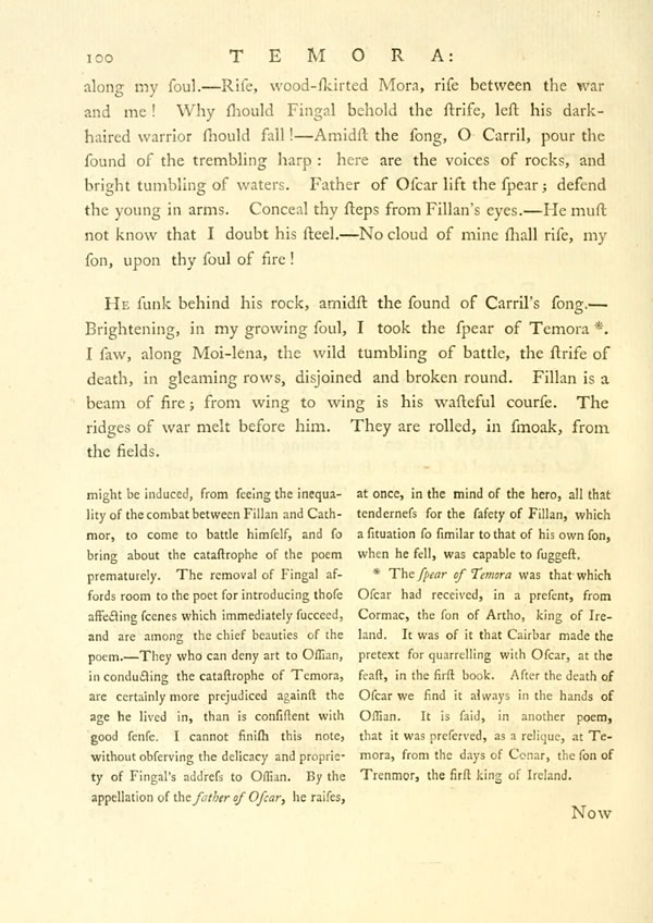 Oscar! said the dark-red Cairbar, I behold the spearDisplay note of Inisfail. [ 12 ] View Page Image The spear of TemoraDisplay note glitters in thy hand, son of woody Morven! It was the pride of an hundredDisplay note kings, the death of heroes of old. Yield it, son of Ossian, yield it to car-borne Cairbar.
