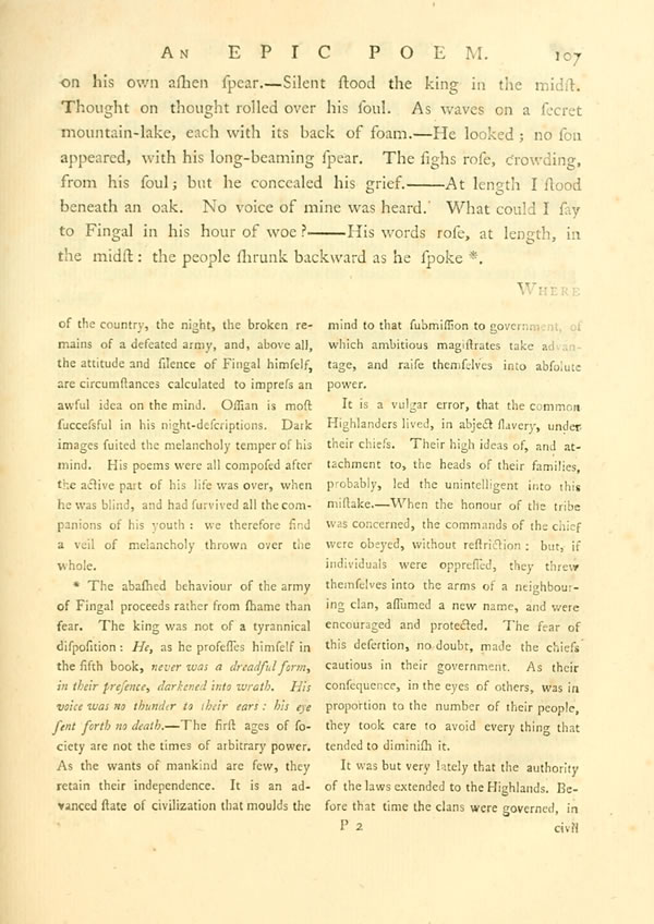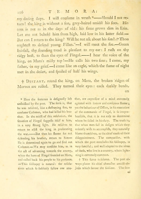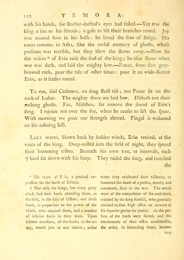The night would have descended in sorrow, and morning returned in the shadow of grief: our chiefs would have stood like cold dropping rocks on Moi-lena, and have forgot the war, did not the king disperse his grief, and raise his mighty voice. The chiefs, as new-wakened from dreams, lift up their heads around.