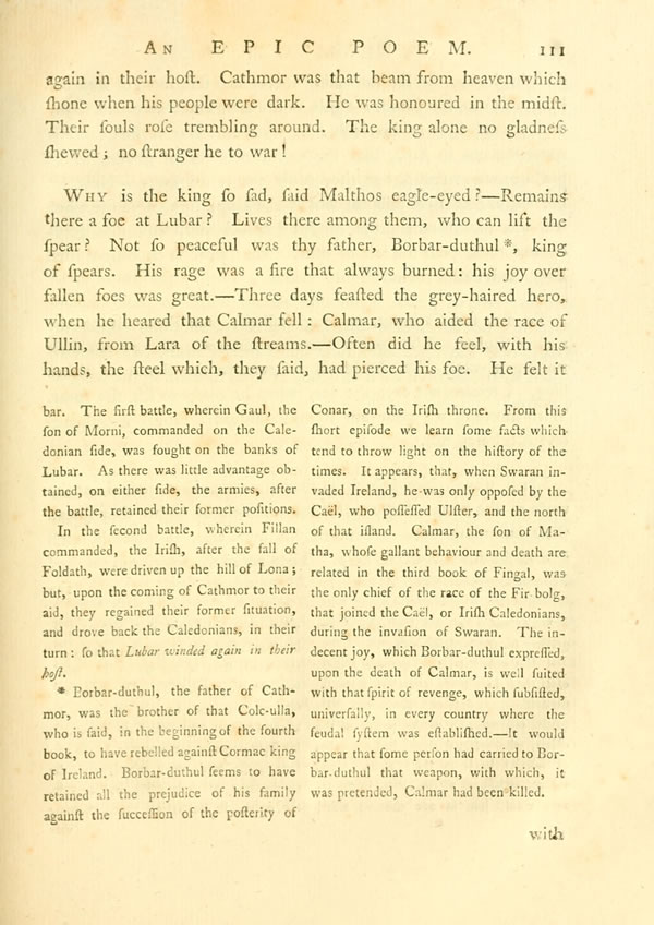 Why is the king so sad, said Malthos eagle-eyed?— Remains there a foe at Lubar? Lives there among them, who can lift the spear? Not so peaceful was thy father, Borbar-duthulDisplay note, king of spears. His rage was a fire that always burned: his joy over fallen foes was great.—Three days feasted the grey-haired hero, when he heared that Calmar fell: Calmar, who aided the race of Ullin, from Lara of the streams.—Often did he feel, with his hands, the steel which, they said, had pierced his foe. He felt it [ 112 ] View Page Imagewith his hands, for Borbar-duthul's eyes had failed.— Yet was the king a sun to his friends; a gale to lift their branches round. Joy was around him in his halls: he loved the sons of Bolga. His name remains in Atha, like the awful memory of ghosts, whose presence was terrible, but they blew the storm away.—Now let the voicesDisplay noteof Erin raise the soul of the king; he that shone when war was dark, and laid the mighty low.—Fonar, from that grey-browed rock, pour the tale of other times: pour it on wide-skirted Erin, as it settles round.