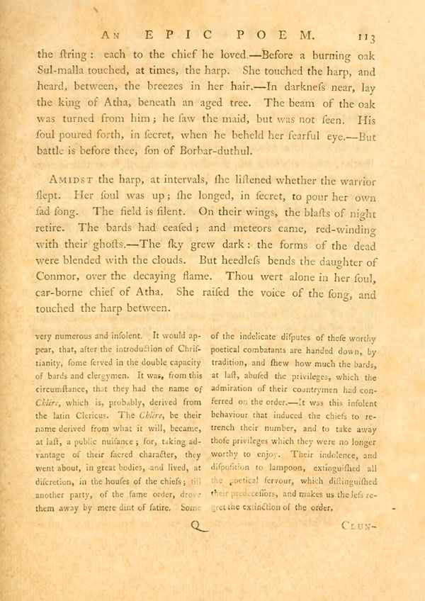 Beneath the moss-covered rock of Lona, near his own blue stream; grey in his locks of age, dwells ClonmalDisplay note king of harps. Above him is his echoing tree, and the dun bounding of roes. The noiseDisplay note of our strife reaches his ear, as he bends in the thoughts of years. There let thy rest be, Sul-malla, until our battle cease. Until I return, in my arms, from the skirts of the evening mist, that rises, on Lona, round the dwelling of my love.