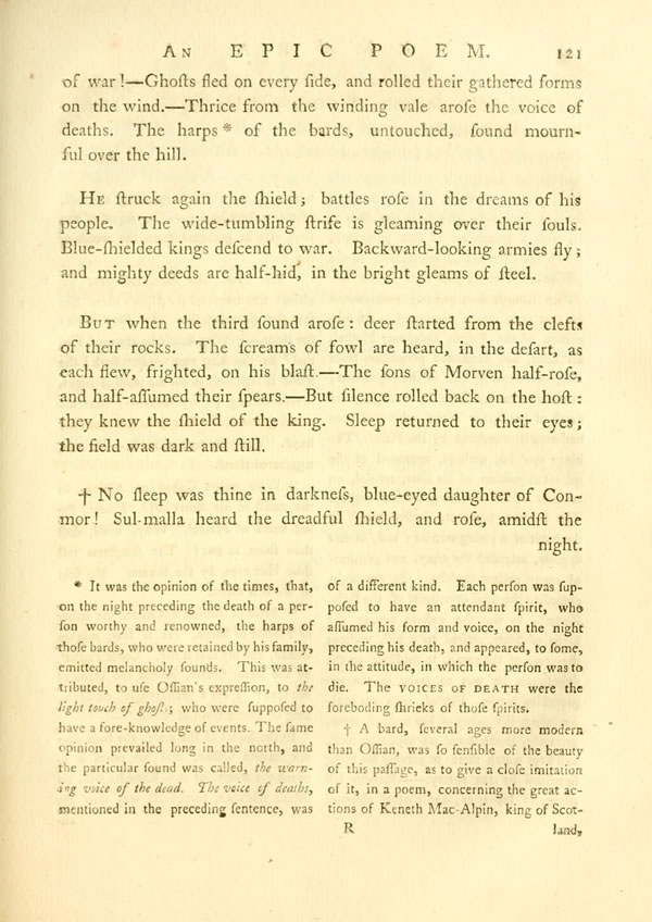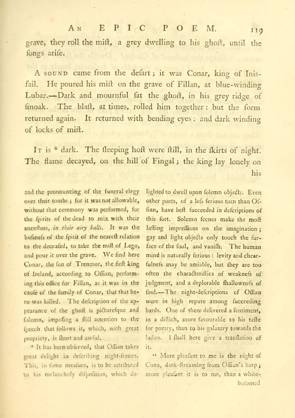 Display noteFrom the wood-skirted waters of Lego, ascend, at times, grey-bosomed mists; when the gates of the west are closed, on the sun's eagle-eye. Wide, over Lara's stream, is poured the vapour dark and deep: the moon, like a dim shield, is swimming thro' its folds. With this, clothe the spirits of old their sudden gestures [ 118 ] View Page Imageon the wind, when they stride, from blast to blast, along the dusky night. Often, blended with the gale, to some warrior's [ 119 ] View Page Imagegrave, they roll the mist, a grey dwelling to his ghost, until the songs arise.